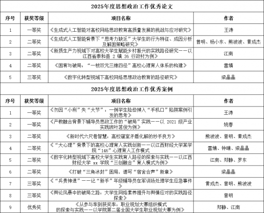 六合彩资料 辅导员队伍紧扣时代脉搏,围绕学生成长规律、网络思政教育、心理健康育人等方向展开深入研究,提交的工作论文与案例兼具理论深度与实践价值。其中,王涛撰写的《生成式人工智能对高校网络思政教育高质量发展的挑战与应对研究》凭借其创新性研究方法与可推广的实践路径,经专家评审推荐至省级思政工作优秀成果评选。