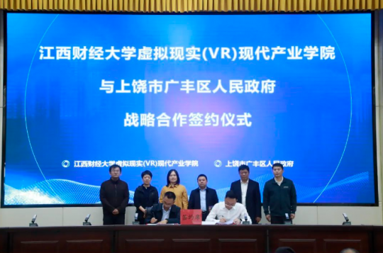虚拟现实(VR)现代产业学院 4月25日,院长万征、产业副院长汪翠芳一行赴上饶市广丰区开展深度调研,并与上饶市广丰区人民政府开展座谈并签订战略合作协议。上饶市广丰区委副书记、区长姚晗,区委常委、组织部部长汪雅达,副区长、上饶高新区党工委书记蒋小晖,区政协副主席刘成业出席仪式。